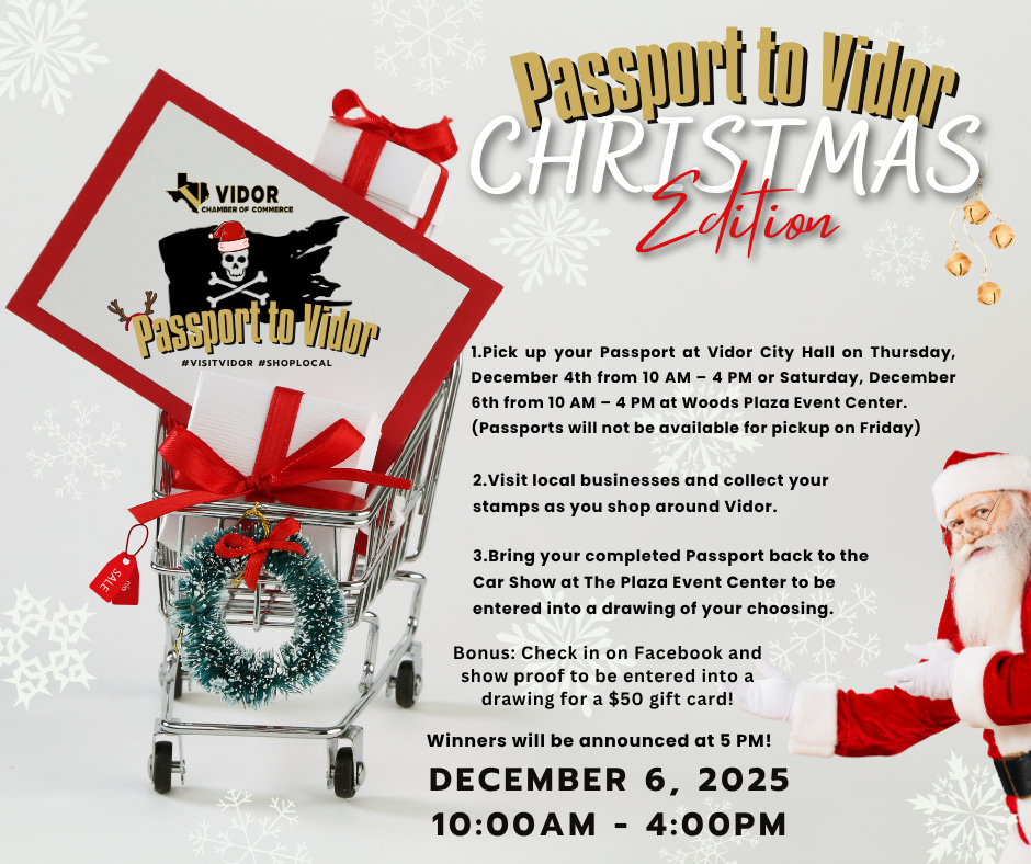 From Friday, December 5th through Saturday, December 6th, the Vidor Chamber of Commerce will once again host our Passport to Vidor event to help support our local businesses this holiday season!